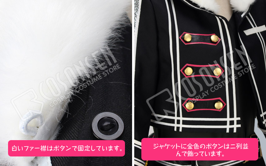 黒を基調したポリ混紡にて製作します。白いファー襟は付いていて、ふわふわと感じられます。正面には白いラインが何本飾っており、右側に二列の金色のボタンは並んで飾っています。よく原作を再現しました。