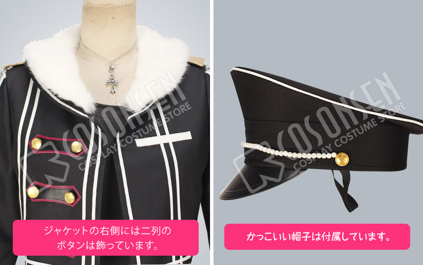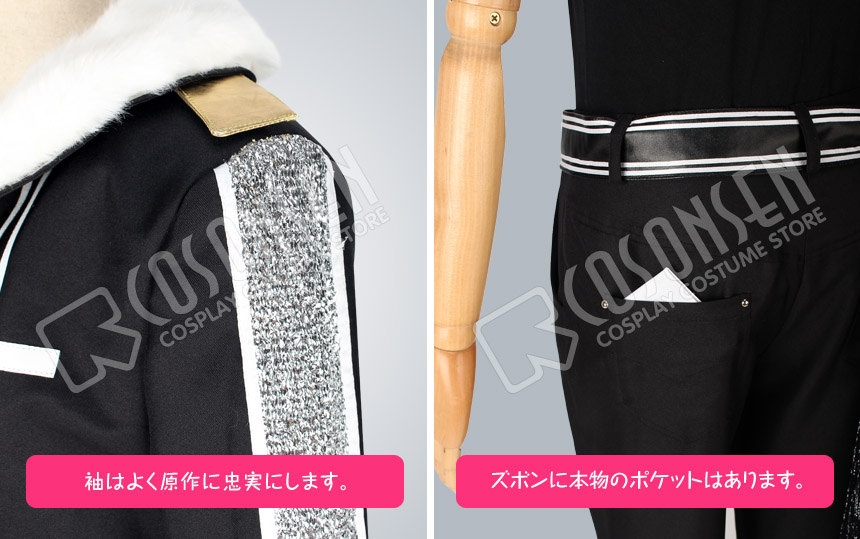 黒を基調したポリ混紡にて製作します。白いファー襟は付いていて、ふわふわと感じられます。正面には白いラインが何本飾っており、右側に二列の金色のボタンは並んで飾っています。よく原作を再現しました。