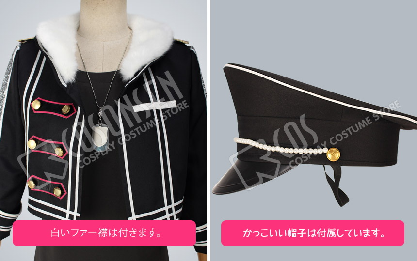 黒を基調したポリ混紡にて製作します。白いファー襟は付いていて、ふわふわと感じられます。正面には白いラインが何本飾っており、右側に二列の金色のボタンは並んで飾っています。よく原作を再現しました。