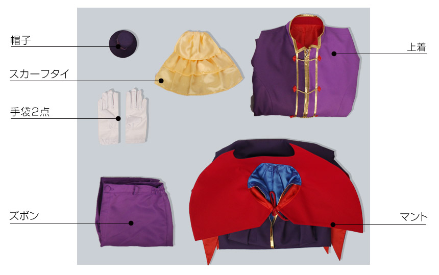 上着、ズボン、マント、飾り物(手袋2点、スカーフタイ、帽子)