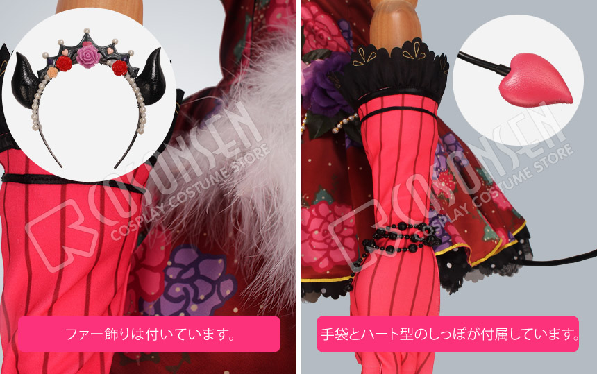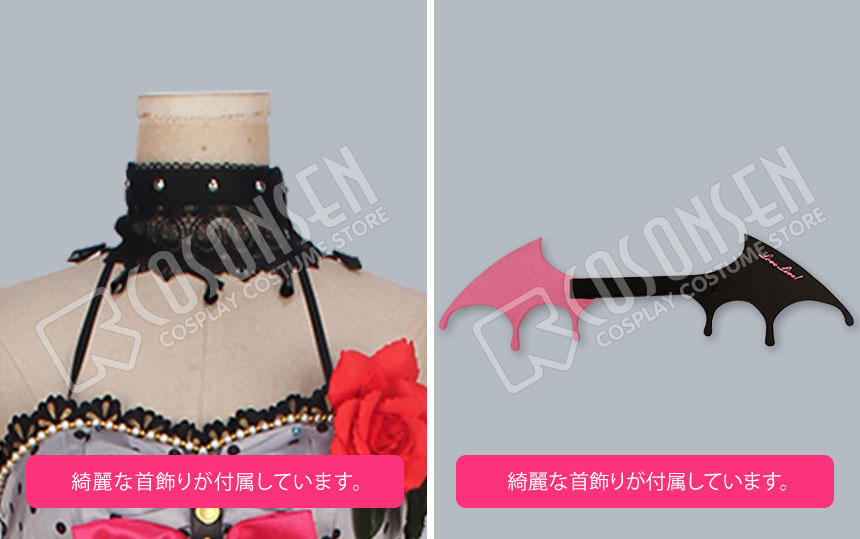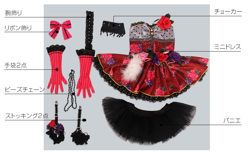 カチューシャ、チョーカー、リボン飾り、腕飾り、手袋2点、翼2点、尻尾、花飾り、ストッキング2点、ビーズチェーン、パニエも付属しています。