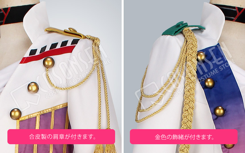 白を基調したポリ混紡と合皮、サテンにて製作します。合皮製の肩章は金色の飾緒が付きます。金色の縁取りで飾られます。かっこよく見えます。