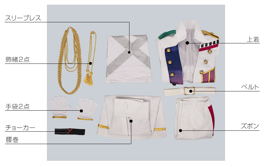 上着、スリーブレス、ズボン、飾り物(腰巻、ベルト、手袋2点、チョーカー、飾緒2点)