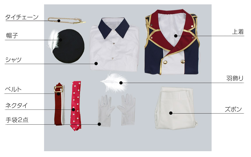 上着、シャツ、ズボン、飾り物(ネクタイ、タイチェーン、手袋2点、帽子、ベルト、羽飾り)