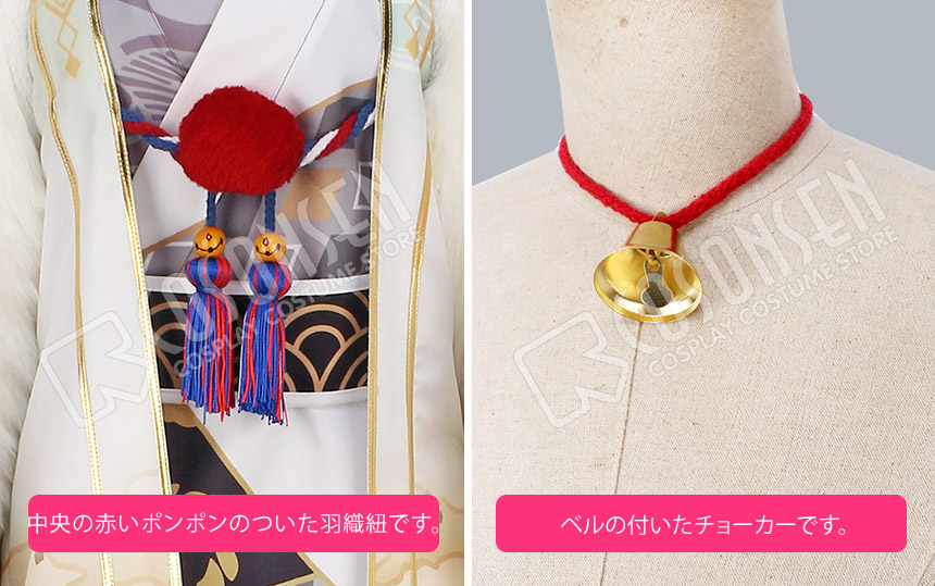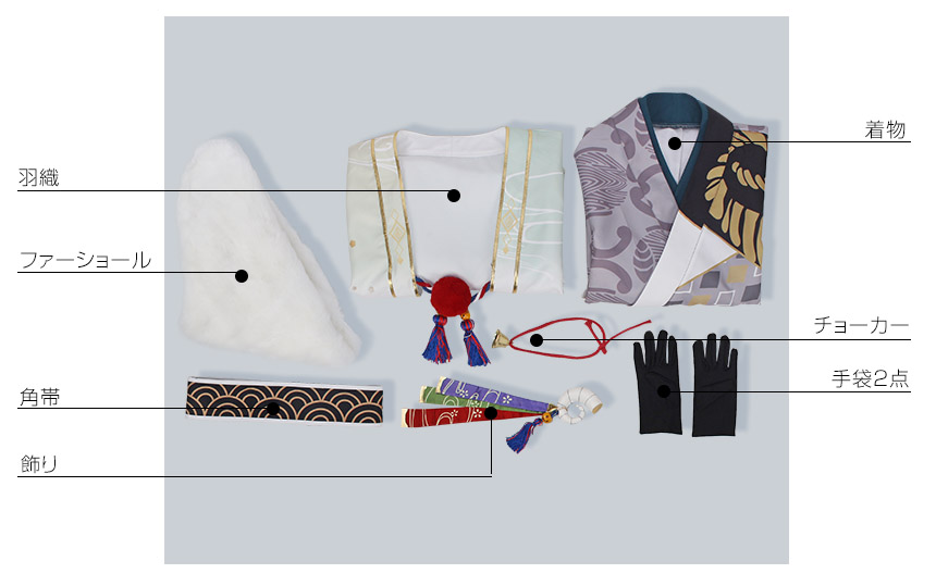 角帯、ファーショール、手袋2点、飾り、チョーカーも付属しています。