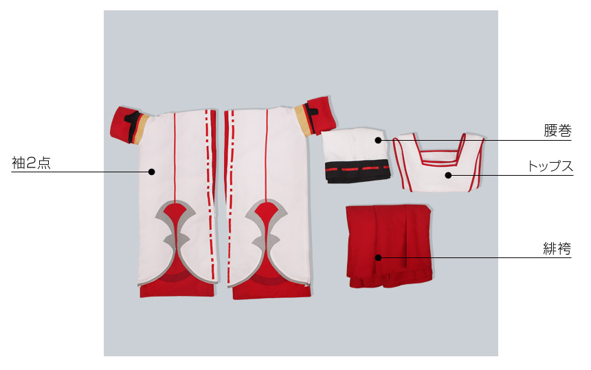 トップス、インナー、カットソー、緋袴、飾り物(髪留め2点、頭飾り、重ね衿、タスキ、帯、飾り結び、 袖2点、腰巻、足袋2点、飾り3点)