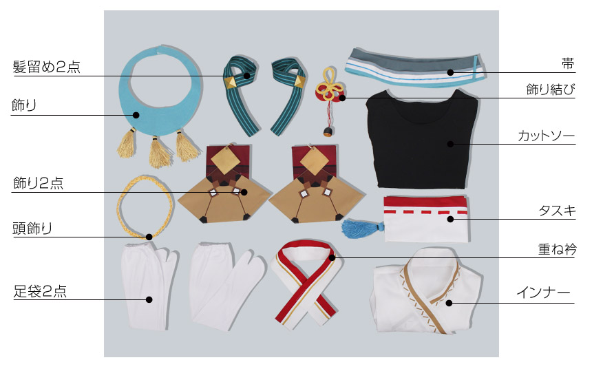 髪留め2点、頭飾り、重ね衿、タスキ、帯、飾り結び、 袖2点、腰巻、足袋2点、飾り3点も付属しています。