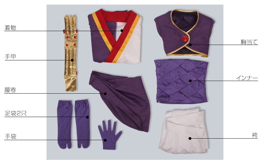 着物、胸当て、インナー、袴、飾り物(手甲、腰巻、手袋、足袋2点)