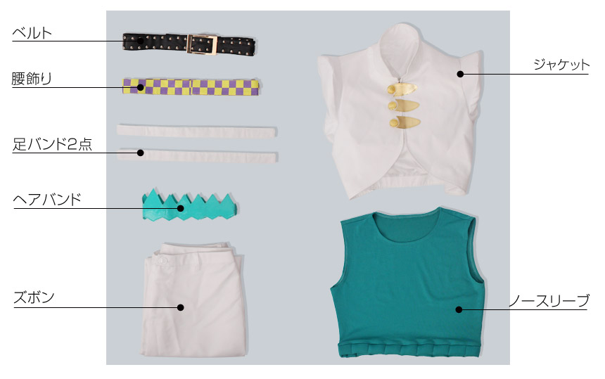 ジャケット、ノースリーブ、ズボン、飾り物(ベルト、腰飾り、足バンド2点、ヘアバンド)