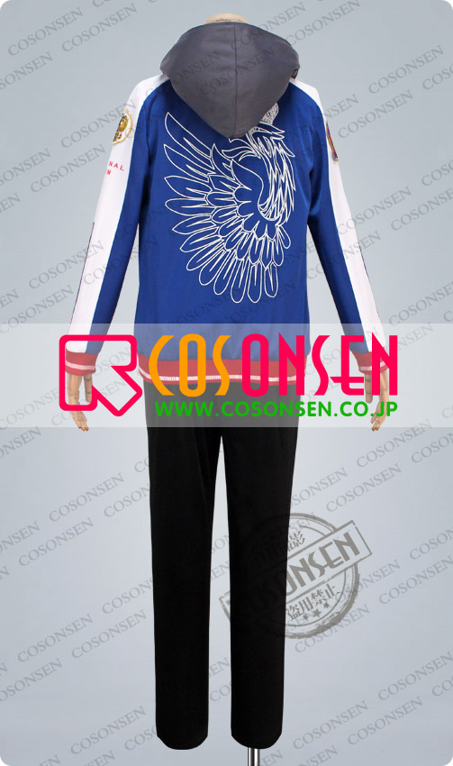 青を基調したジャージ生地にて製作します。肩のワッペンがよく再現しました。ファスナーポケットが付きます。後ろには鷹の柄がプリントされています。