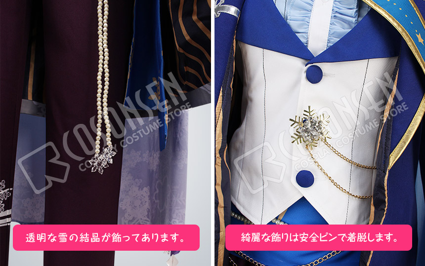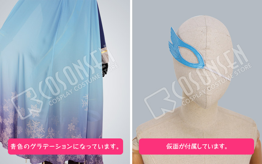 青色を基調したシフォンにて製作します。青と紫のグラデーションになっています。裾には雪の結晶の絵柄がプリントされており、透明な雪の結晶と菱形の飾りが付いています。