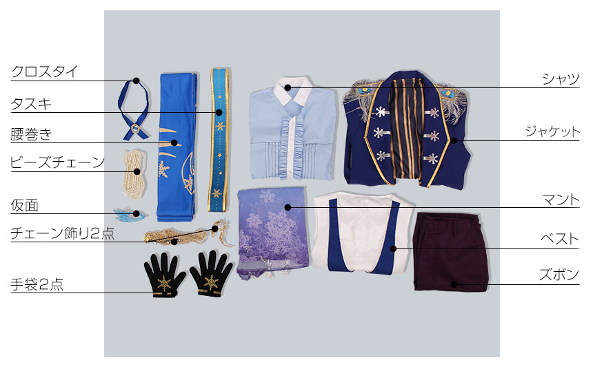 マント、ジャケット、ベスト、シャツ、ズボン、飾り物(クロスタイ、タスキ、腰巻、チェーン飾り2点、ビーズチェーン、手袋2点、仮面)