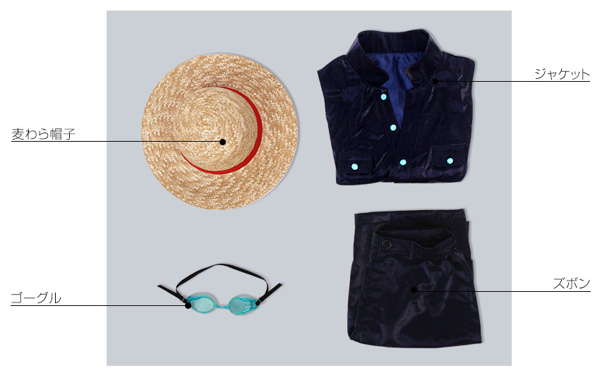 ジャケット、ズボン、飾り物(麦わら帽子、ゴーグル)