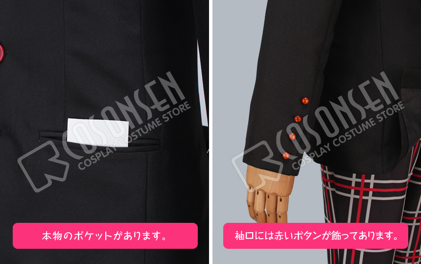 黒を基調したポリ混紡にて製作します。胸元にはポケットが付いています。袖口には赤いボタンが飾ってあります。よく原作のデザインを再現しました。