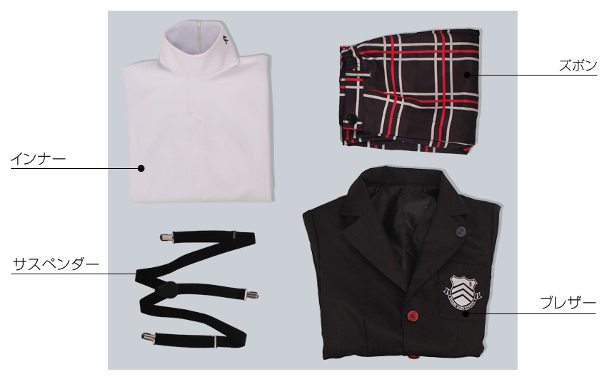 ブレザー、インナー、ズボン、飾り物( サスペンダー)