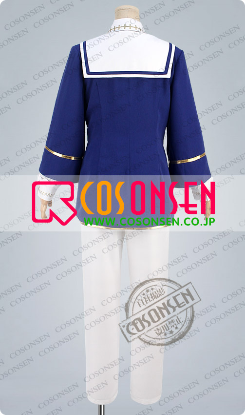 紺色を基調した厚手ポリ混紡にて製作します。正面と袖口には金色の縁取りが飾ってあります。襟はセーラーカラーのデザインです。