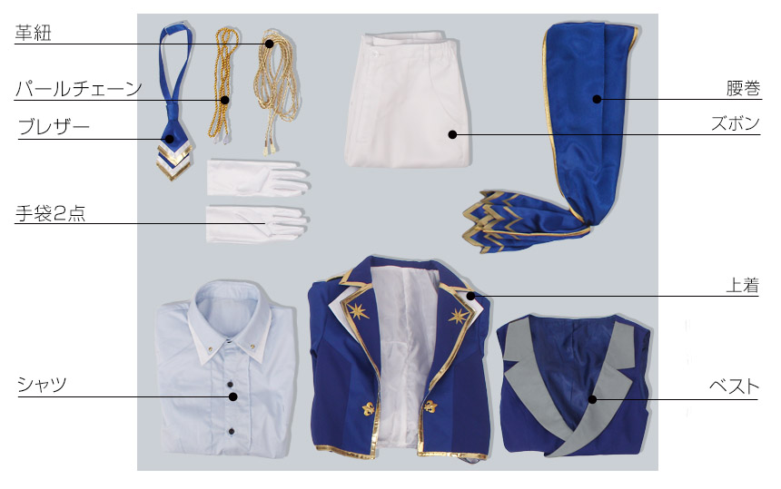 上着、ベスト、シャツ、ズボン、飾り物(ネクタイ、パールチェーン、手袋2点、腰巻、革紐、ヘッドポン)