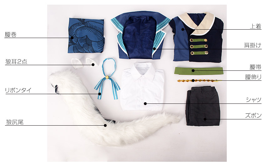 上着、シャツ、ズボン、飾り物(狼耳2点、肩掛け、リボンタイ、腰帯、腰巻、腰飾り、狼尻尾)