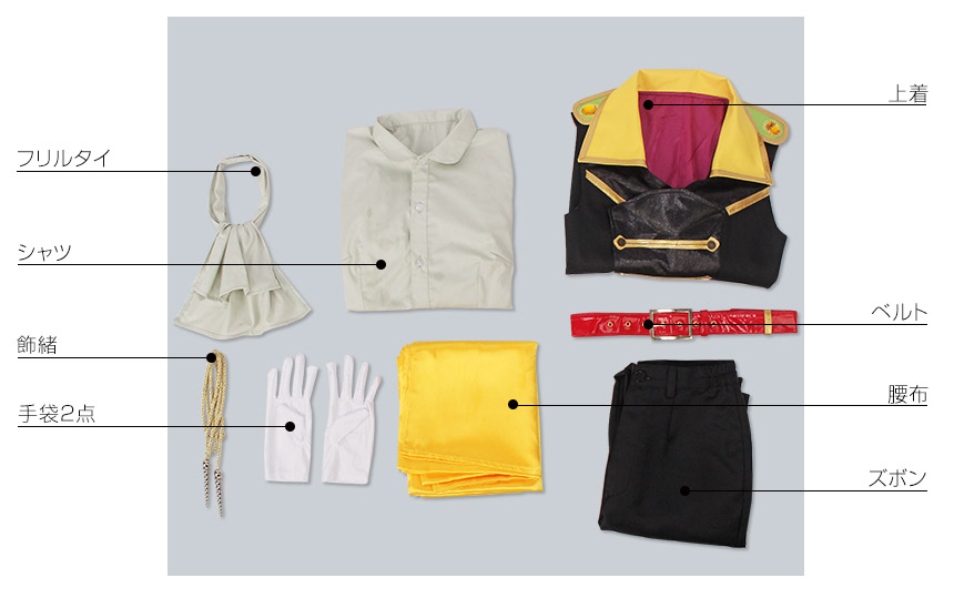 上着、シャツ、ズボン、飾り物(フリルタイ、飾緒、手袋2点、ベルト、腰布)