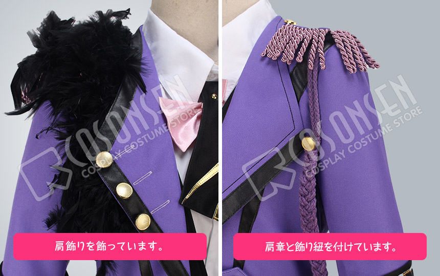 紫を基調したポリ混紡にて製作します。正面に黒いラインが飾ってあり、右襟には金色のボタンが付いています。袖は七分丈です。折り返された袖口には金色のラインが飾ってあり、とてもかっこいいです。