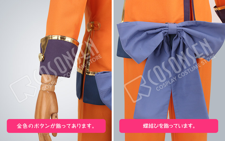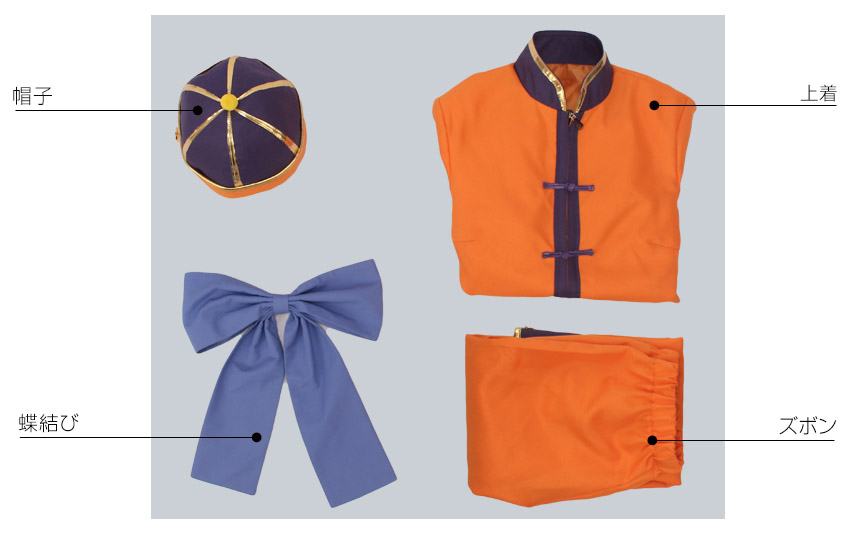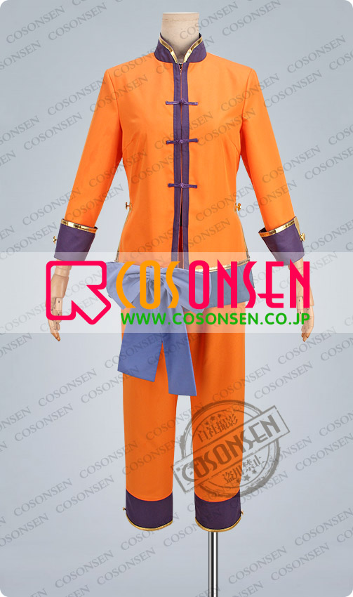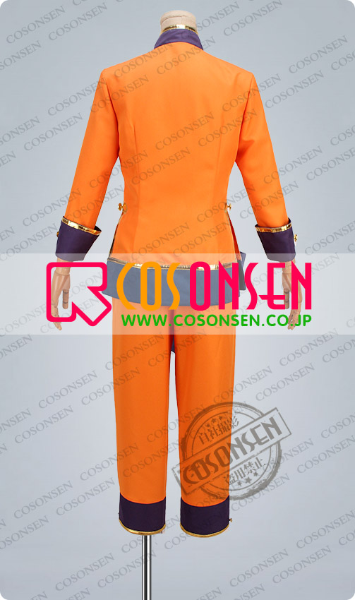 オレンジ色を基調したポリ混紡にて製作します。立ち襟のデザインです。衣装の周りに金色のラインが縫い付けられています。両脇にサイドベンツが付き、袖口は折り返しの状態で、とてもかっこいいです。ファスナーと紐ボタンで着脱します。