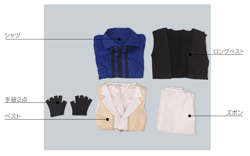 ロングベスト、ベスト、シャツ、ズボン、飾り物(手袋2点)