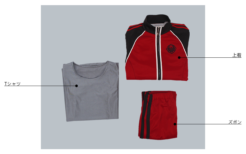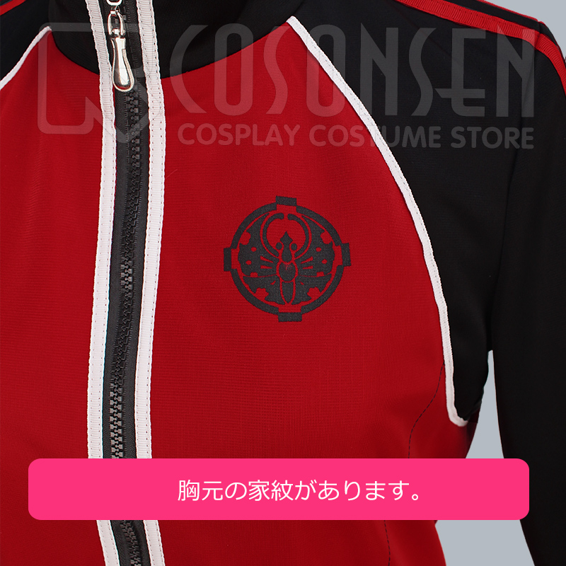 赤と黒を基調したジャージ生地にて製作します。胸元に家紋がプリントされています。袖と裾をリブ模様にしています。メッシュ裏地が付きます。