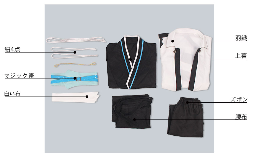 羽織、上着、ズボン、飾り物(マジック帯、紐4点、腰布、白い布)