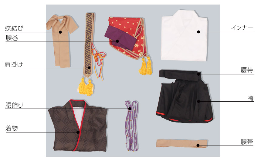 着物、インナー、袴、飾り物(肩掛け、腰帯2点、蝶結び、腰巻、腰飾り)