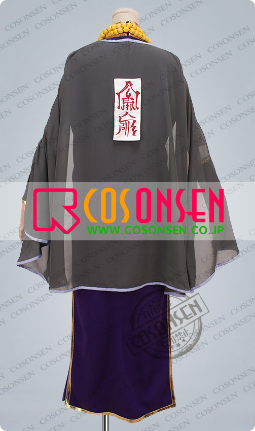 黒を基調したポリ混紡にて製作します。両サイドに縦に切れ目が入って、裾には紫の縁取りが付き、よく原作に忠実しています。