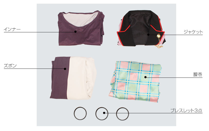 ジャケット、インナー、ズボン、飾り物(ブレスレット3点、腰巻)