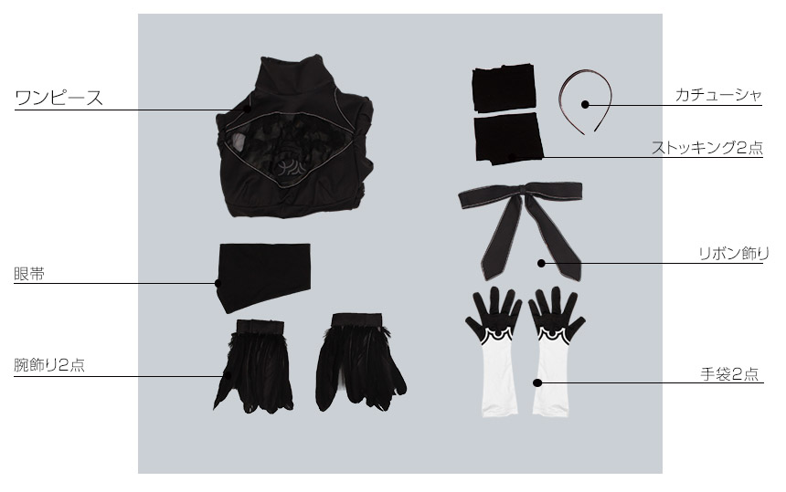 カチューシャ、眼帯、腕飾り2点、手袋2点、リボン飾り、ストッキング2点も付属しています。