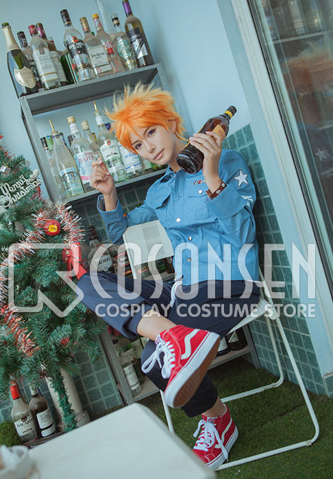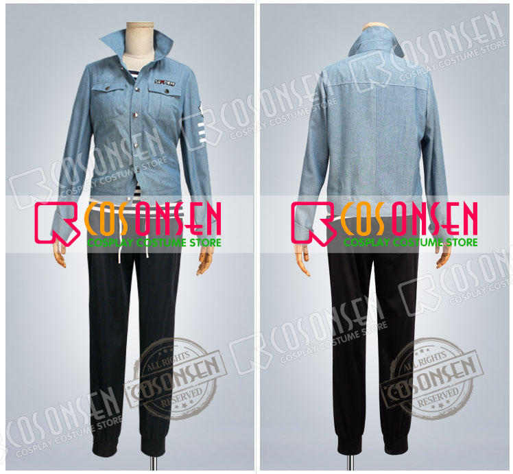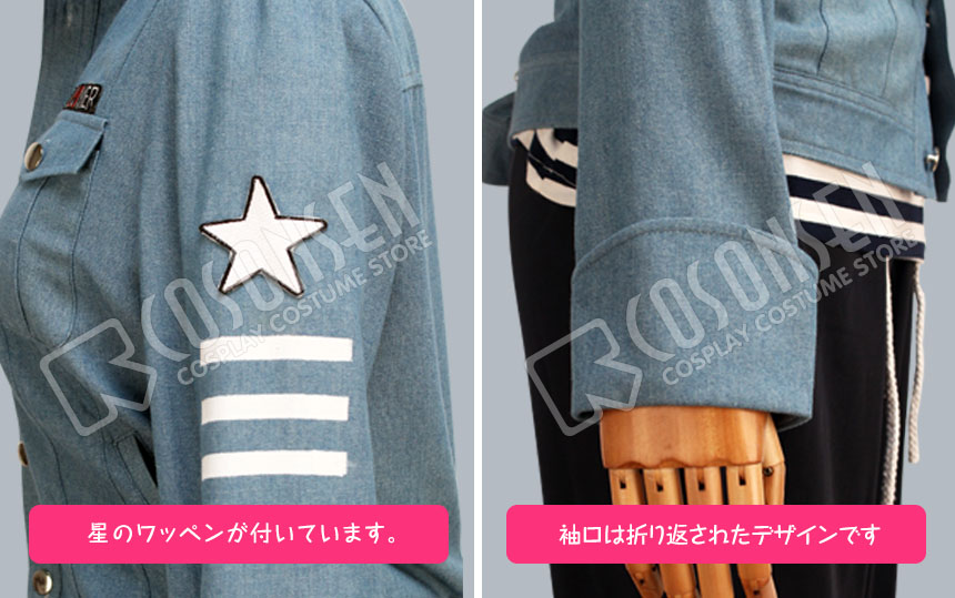デニム生地で製作しました。丈短めのデザインです。袖口は折り返された状態で、左袖には星のワッペンと白いラインが飾ってあります。胸にsummerの文字が付き、よく原作に忠実しています。