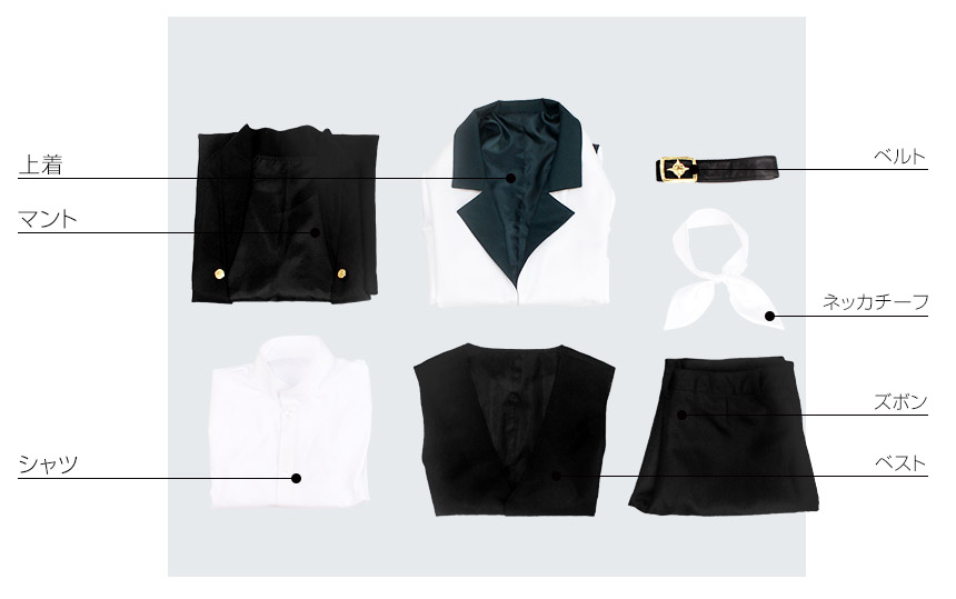 上着、ベスト、シャツ、ズボン、飾り物(マント、ネッカチーフ、ベルト)