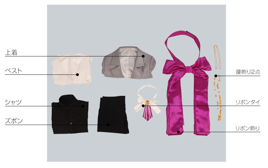 上着、ベスト、シャツ、ズボン、飾り物(リボンタイ、腰飾り2点、リボン飾り)