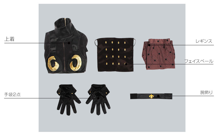レギンス、フェイスベール、腕飾り、手袋2点も付属しています。