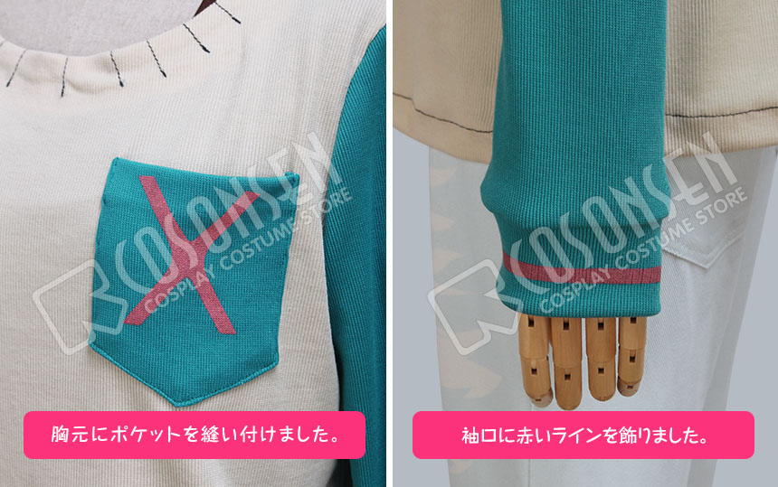 デニム生地で製作しました。前には白い絵柄がプリントされて、よく原作に忠実に再現しました。シンプルなデザインで、普段着もできます。
