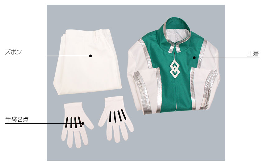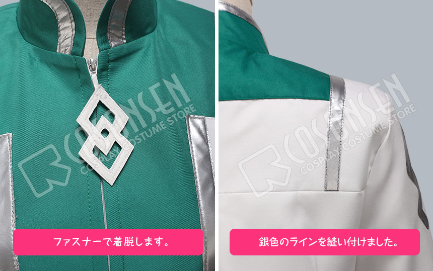 ポリ混紡で製作しました。立ち襟のデザインで、ファスナーで着脱しやすいです。上着には銀色のラインを縫い付けました。袖口は折り返しの状態で、とてもかっこいいです。