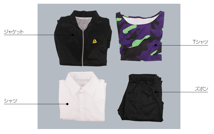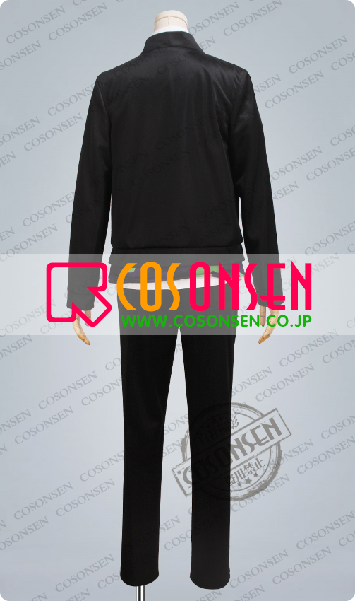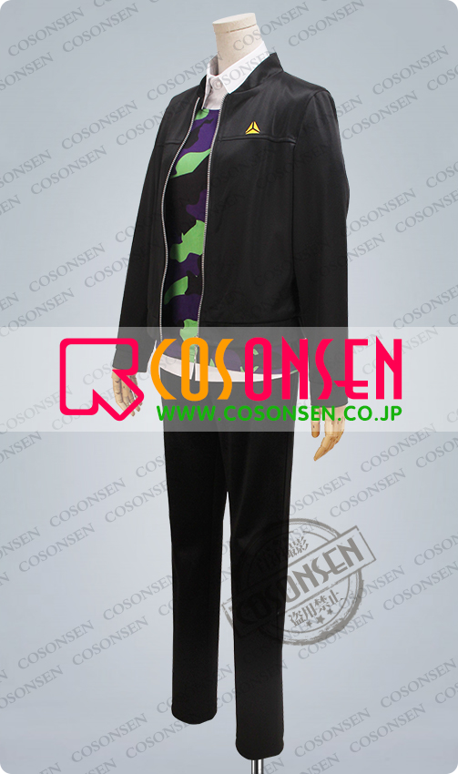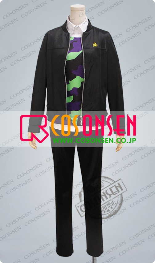 ジャージ生地で製作しました。上着は真っ黒な生地で作られ、胸元に三角形で黄色いバッジのような絵柄がプリントされて、とても格好よく見えます。裏地はちょっと裏起毛の感じがします、予めご了承ください。