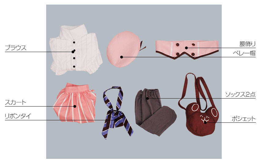 ベレー帽、リボンタイ、腰飾り、ポシェット、ソックス2点も付属しています。