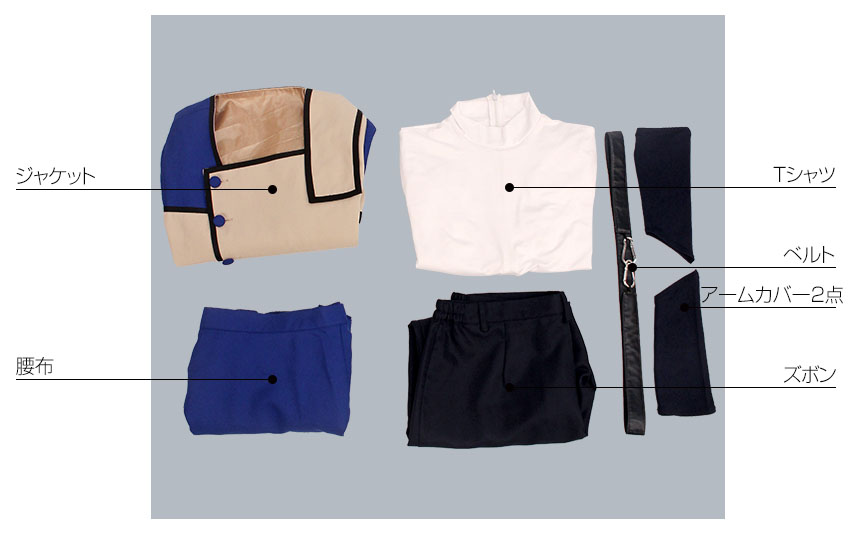 ジャケット、Tシャツ、ズボン、飾り物(アームカバー2点、ベルト、腰布)