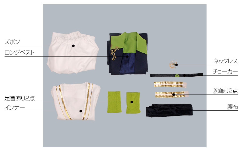 ロングベスト、インナー、ズボン、飾り物(チョーカー、ネックレス、腰布、腕飾り2点、首足飾り2点)