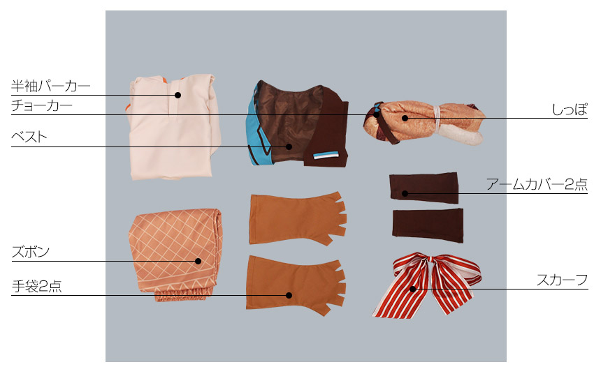 ベスト、半袖パーカー、ズボン、飾り物(チョーカー、スカーフ、アームカバー2点、手袋2点、しっぽ)