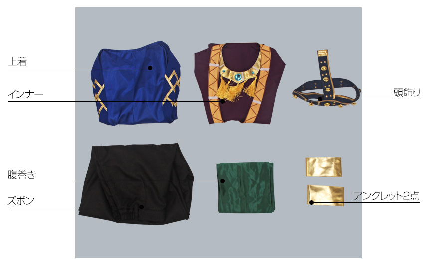 上着、インナー、ズボン、飾り物(頭飾り、腹巻き、アンクレット2点)
