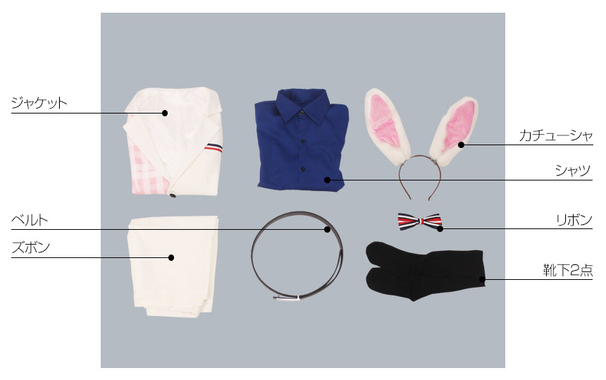 ジャケット、シャツ、ズボン、飾り物(カチューシャ、リボン、ベルト、靴下2点)