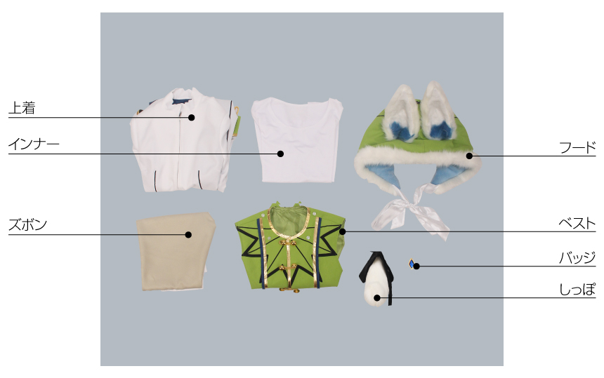 ベスト、上着、インナー、ズボン、飾り物(フード、バッジ、しっぽ)