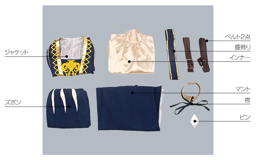 ジャケット、インナー、ズボン、飾り物(マント、襟、ベルト2点、腰飾り、ピン)