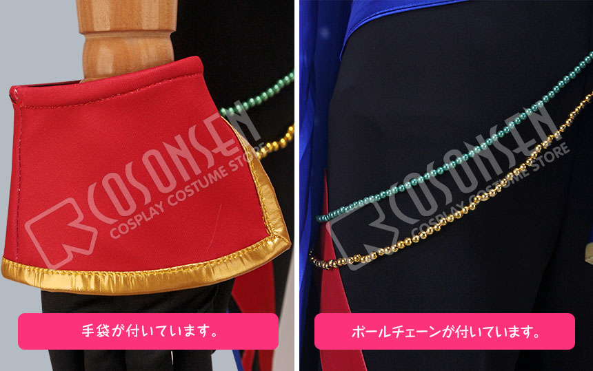 マント、胸飾り、ベルト2点、腰布、ボールチェーン2点、手袋2点も付属しています。
