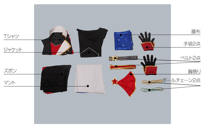 ジャケット、Tシャツ、ズボン、飾り物(マント、胸飾り、ベルト2点、腰布、ボールチェーン2点、手袋2点)