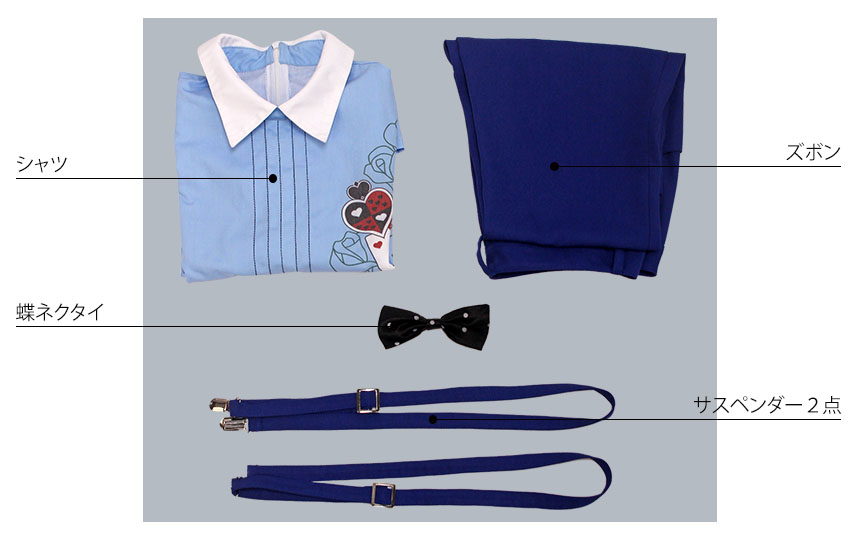 シャツ、ズボン、飾り物(蝶ネクタイ、サスペンダー2点)